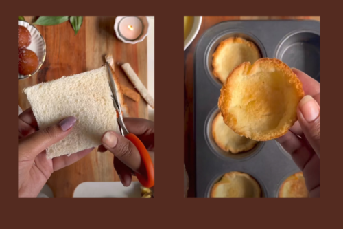 - Bake: Place the ghee-coated bread rounds into cupcake moulds, pressing them gently to form cup shapes. Pop them in a preheated oven at 210°C for about 8 minutes or until they’re golden and crispy. Set them aside to cool.